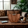 Eine Frau hält eine braune Ledertasche