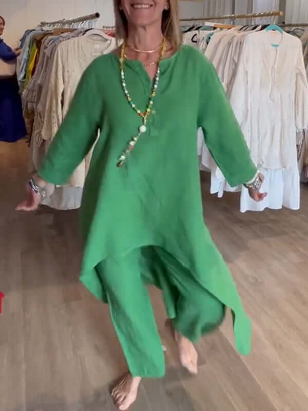 Leinenanzug vonl ist die ideale Wahl für warme Tage. Gefertigt aus atmungsaktivem Leinen bietet das Set aus Oberteil und Hose eine lockere Passform und zeitlose Eleganz. Ob im Alltag, im Büro oder im Urlaub – mit diesem Outfit sind Sie stets stilvoll unterwegs.