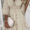 Kleid ist dein perfekter Begleiter für sonnige Strandtage, entspannte Urlaube oder sommerliche Städtetrips. Der leichte Stoff, das schmeichelhafte V-Ausschnitt-Design und die feinen Stickereien verleihen diesem Kleid einen stilvollen und bohemian Look.